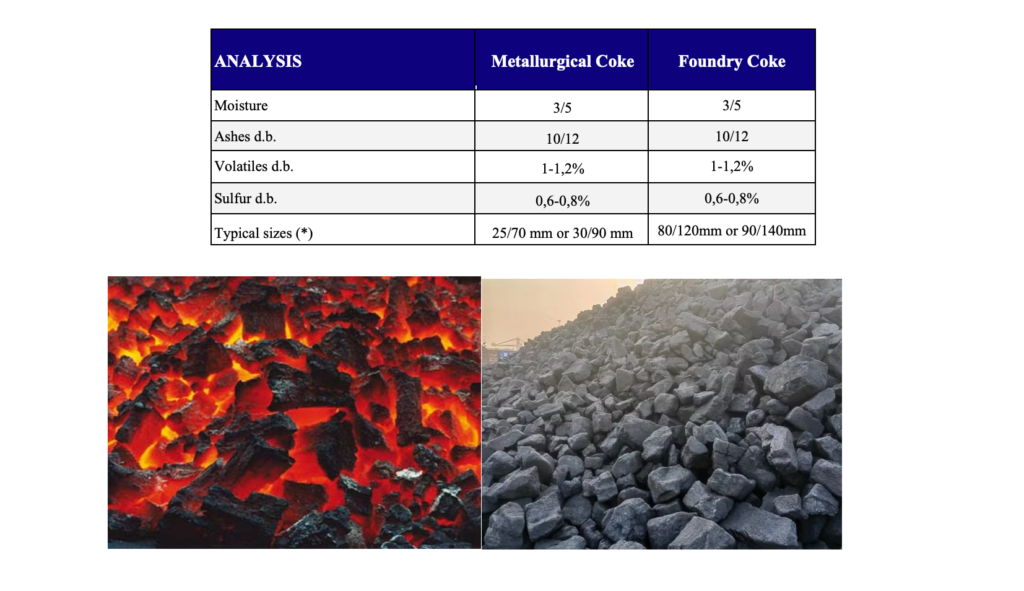 Coke for metallurgical and foundry operations, offered in typical lump sizes required for furnaces and melting processes.